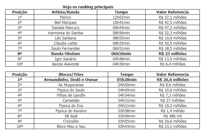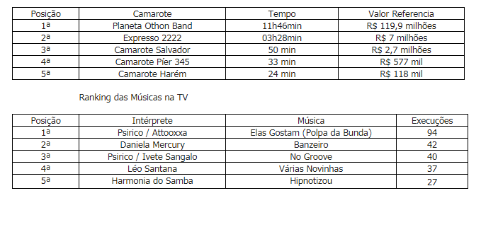 Em alta por conta das músicas "Elas Gostam" e "No Groove", parceria com Ivete Sangalo, a banda Psirico foi o líder em exibições da mídia local no Carnaval deste ano com mais de 12 horas de exposição nas transmissões e coberturas jornalísticas das principais emissoras de TV da capital e redes nacionais, segundo levantamento realizado pela empresa de monitoramento MidiaClip entre os dias 08 e 13 de fevereiro – os dias oficiais do Carnaval. O grupo foi seguido pelo cantor Bell Marques em sua comemoração pelos 40 anos do bloco Camaleão (10 horas e 41 minutos), por Daniela Mercury (mais de nove horas), Harmonia do Samba (quase nove horas de exposição) e Léo Santana (com suas 8h55min de ocupação de espaço televisivo). Já Cláudia Leitte liderou em relação ao cálculo simulado do seu tempo de exibição, tendo como base as tabelas publicitárias das emissoras pesquisadas. Por aparecer em horários nobres das transmissões e obter exposição nacional em telejornais, a medição comercial do seu tempo ultrapassou o montante de R$ 50 milhões, seguida de Daniela Mercury (R$ 47,2 milhões) e o próprio Psirico (R$ 37 milhões). Entre os blocos e trios, o Armandinho, Dodô e Osmar garantiram a primeira colocação (05h28min), seguido por As Muquiranas (04h50min) e a Pipoca do Saulo (04h45min). Já entre os camarotes, o Planeta Othon Band foi o bicampeão da categoria ficando na primeira colocação com 11h46min, seguido pelo novamente vice-campeão Expresso 2222 (03h28min) e Camarote Salvador (50 minutos). “O levantamento está completando 15 anos e é uma contribuição para medir resultados de marketing na maior festa popular do país”, afirma o jornalista Luís Cláudio Garrido. “Associar marcas importantes a estes artistas é obter resultados seguros de imagem e garantia de sucesso nas estratégias de mercado para produtos e empresas”. A pesquisa registra apenas a mídia espontânea, ou seja, o espaço editorial gratuito das emissoras de TV destinado às transmissões e noticiário sobre a folia no Carnaval de Salvador.