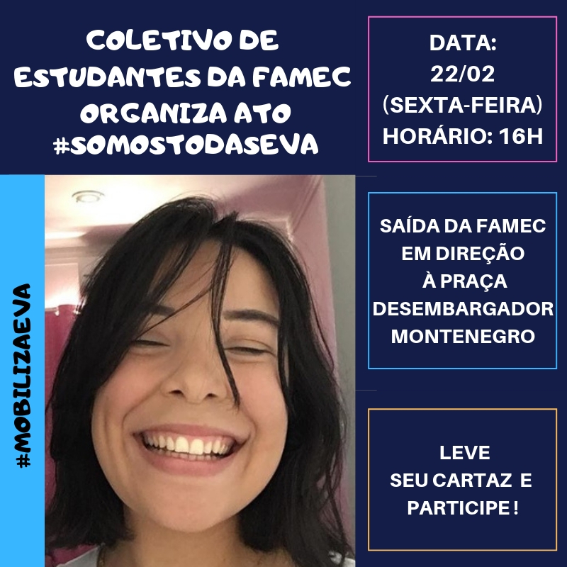 Por todos os cantos de Camaçari, ecoa o mesmo clamor. Todos querem justiça, colaborar para que, de alguma forma, a dor de Eva seja amenizada. Desde que tomou ciência do caso, a cidade inteira tem se unido. Uma multidão de pessoas solidárias clamando por justiça. Nas redes sociais, já são incontáveis as manifestações e campanhas de apoio e solidariedade. Além disso, diversos grupos já estão se mobilizando para realizar movimentos públicos em defesa de Eva. O primeiro deles acontece nesta sexta-feira (22). Organizada pelo Coletivo de Estudantes da Faculdade Metropolitana de Camaçari (Famec), a marcha sairá da frente da faculdade em direção à Praça Desembargador Montenegro.