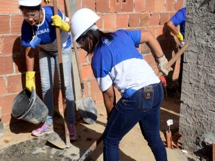 O que aprendeu na teoria é reforçado na prática. Trena no bolso, equipamentos de proteção (capacete e luva), ela prepara a argamassa que será usada para o reboco. Enquanto movimenta a massa com a enxada, dispara. “Terei uma formação, estou feliz demais. Quando ouvi falar no Maria na Construção, corri para garantir uma vaga. Sairei daqui prontinha para trabalhar em muitas obras”, aposta.